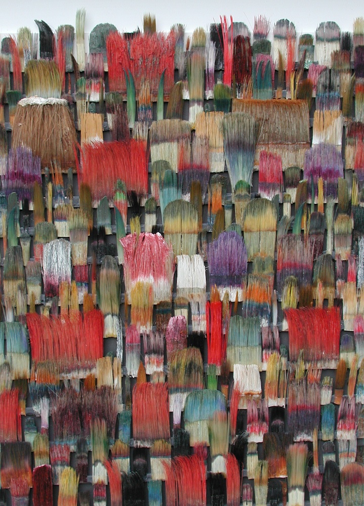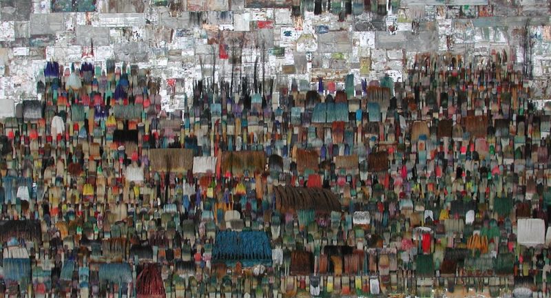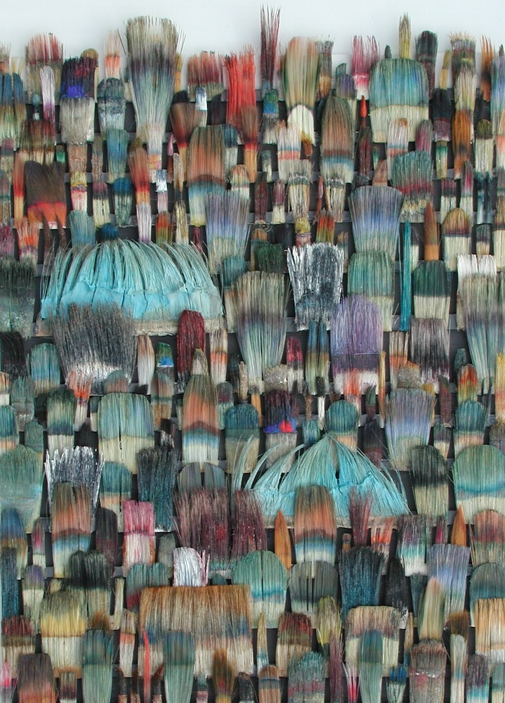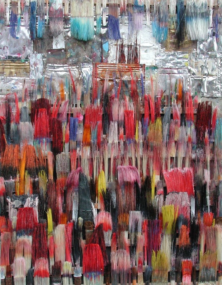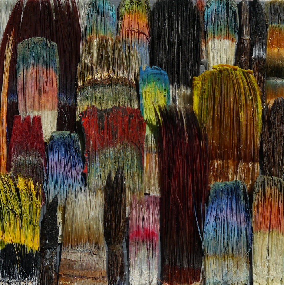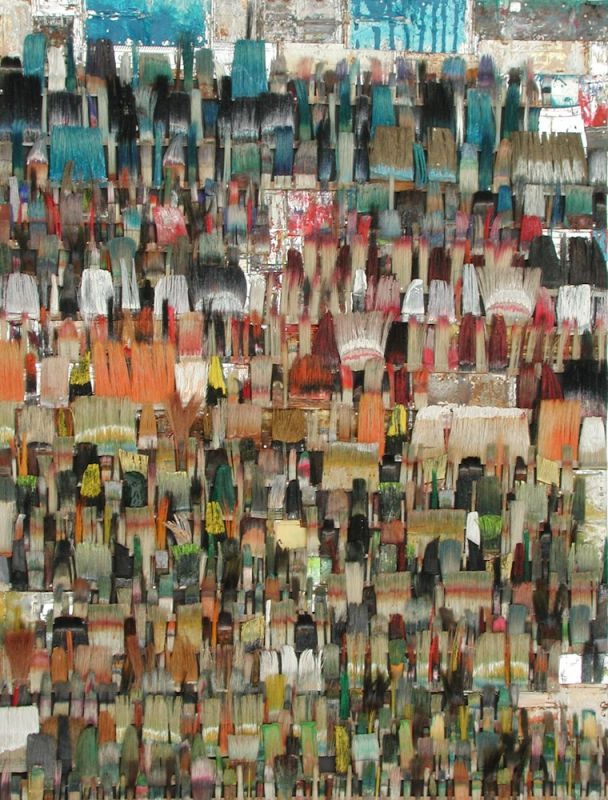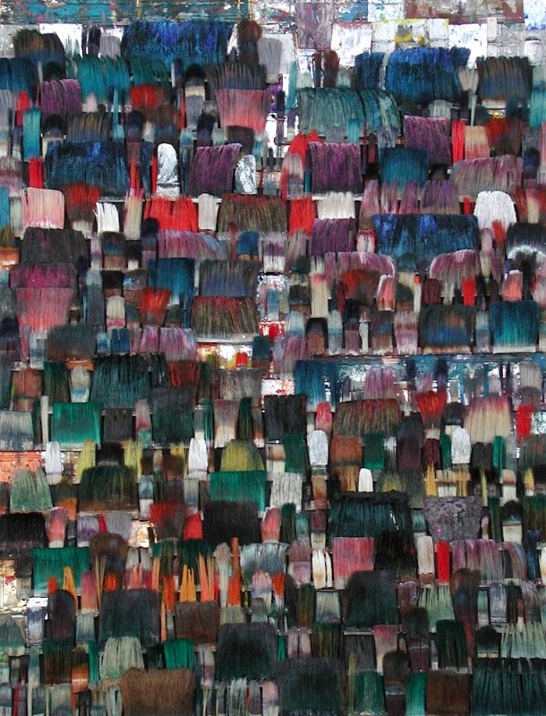 Seit 1994 "malt" Jo Teh mit Pinseln. Pinsel , u.a. von Künstlerkollegensind das Material des Künstlers. Er zerlegt sie in seine Einzelteile und komponiert die farbigen Borsten zu einzigartigen Panoramabildern , die aus der Ferne gleich einer abstrakten Farbfeldmalerei anmuten . Die Metalle der Pinselzwingen bilden oftmals einen glänzenden Hintergrund und erinnern an die kostbaren Silber und Goldauflagen mittelalterlicher Tafelmalerei. Pinsel und ihre Fragmente sind aber auch die Grundlage von -zum Teil Raumgreifenden Objekten. Der enge Zusammmen-schluss von Material, stofflicher Qualität und Form mit der künstlerischen Idee zeichnet die bildplastischen Arbeiten und Installationen aus. Jo Teh interpretiert die vielschichtigen Assoziationen, die mit dem Medium Pinsel verbunden sind, neu. Dabei bleibt das Material und der Charakter der Ausgangsobjekts grundsätzlich unangetasted. Und doch weiß der Künstler das Material so zu bearbeiten, dass das Ergebnis weit über das ursprüngliche Objekt hinausweist. Der Pinsel, der allgemein zur Schaffung der zweidimensionalen Malerei dient, wird selbst zum Bildträger und zum dreidimensionalen Werk. Die eigenwilligen und vielschichtigen " Pinselobjekte " verdichten sich zu originären geistigen und energiegeladenen Materialbildern und Installationen, welche die Grenzen zwischen Malerei und Skulptur hinterfragen und erweitern. Der Künstler nimmt sich in seinem plastischen Schaffen die Freiheit heraus vollkommen offen mit mit dem wichtigsten Werkzeug der Malerei umzugehen. Jo Teh transformiert die Pinsel und setzt sie in einen Spannungsbogen der Kunst und Alltagskultur auf lyrische Art zu verbinden weiß. Die Arbeiten des Künstlers, der in seinen früheren Berufsjahren als Malermeister gearbeitet hat, sind untrennbar mit seiner Biografie verbunden. "1994 habe ich aufgehört herkömmlich zu malen, die Leinwand war grundiert, doch meine Hände weigerten sich. Auf der Suche nach neuen Möglichkeiten, habe ich den Pinsel nicht aus der Hand gegeben, stattdessen habe ich ihn zerlegt und in sein Inneres geschaut." ( Jo Teh )Jo Teh ( geb.1955 in Wachtendonk / Niederrhein ) lebt und arbeitet in Köln . Seit 1995 arbeitet er experimentell und prozesshaft mit Pinseln. 2006 entstand das erste "Panorama". 1998 fand die erste größere Einzelausstellung unter dem Titel " Pinseltransformationen " im " Raum im Duhr " in Langenberg statt. Dr. Gudrun Pamme - Vogelsang